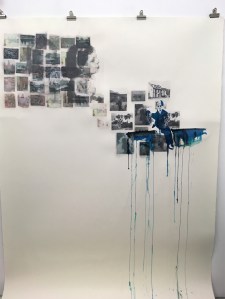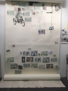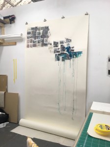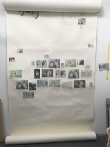 One of the pieces I wanted to make for my final show was a long drawing on a roll of paper, that’s about 150cm wide and 10 metres long. My idea was to start at the top and assemble a series of images that linked from one to the other but also offered some sort of narrative or timeline as the work flowed down the paper. I was influenced by my research on memory, forgetting and the narratives we create for ourselves. And I wanted to make a piece with a process that embodied the idea of the constant and inevitable re-remembering of events and re-writing of the narrative.