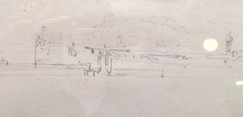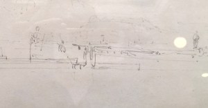 My suggestion is that in making these drawings Turner himself was drawing in an exploratory way, working out as he went what it was that he was seeing, how to place it relative to what was already drawn, and how much weight to give it. I haven’t been able to find out whether these were sketches in preparation for a particular painting and I’m not a painter, but it seems to me that these drawings are like a commentary in his head and hand on what he was seeing. Once he’s understood something, like parts of the barges, he almost gives up on it, with a just the vaguest outline for the rest. There are buildings in the hills that consist of just three lines for the roof slopes – because he has what he needs already. If I’m right, the most defined areas of these drawings would be those which he found it most difficult to see or record, which needed the most work.