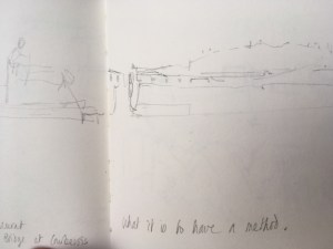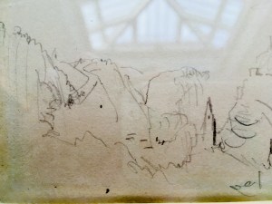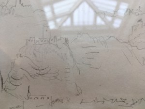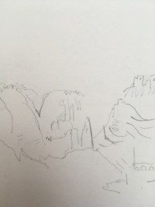 My initial drawings were the product of very intense concentration but the quality of the line was mine, not Turner’s. Things improved when I loosened up, literally holding my pencil more loosely, and drawing more speculatively. Some of the results were much more Turneresque, as in the sketchbook pages below.