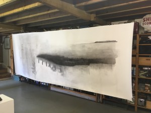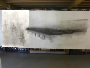 As you can see, the drawing at that stage was successful in parts but the junction between the ‘pylons and grasses’ section and the ‘posts and mud’ section didn’t work. I could have made it into a diptych but I wanted to try to make it work. An impromptu crit with colleagues suggested that the first thing to try would be strengthening the grasses section, which, through drawing/rubbing back/redrawing, had become perhaps a bit too emergent. My studio isn’t big enough for me to see or photograph the whole thing, so here’s a Photoshopped version with the new left hand section stitched to the rest, to show how it’s going. Better but perhaps not yet there.