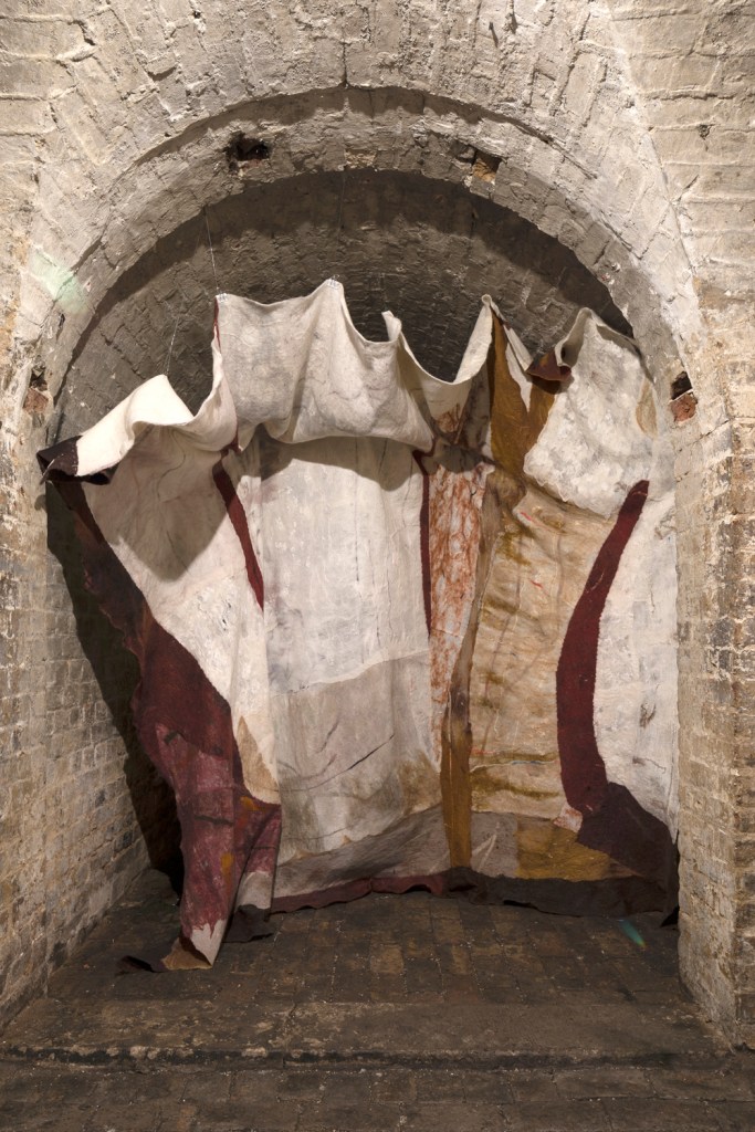 The idea of a skin evokes also the idea of something that surrounds you that you can shed, losing your skin, leaving it behind. To me, this reflects the dual function of an object imbued with memory: you can take it with you, so you don’t forget, but you can also leave it behind, you can deposit it somewhere when you no longer need it. When I was talking about this piece at a meeting of HB Drawing, and describing how I make felt, Andrew Youngson drew a parallel with the making and remaking of memory in the present: remembering as transformation – felt as a process of transformation.