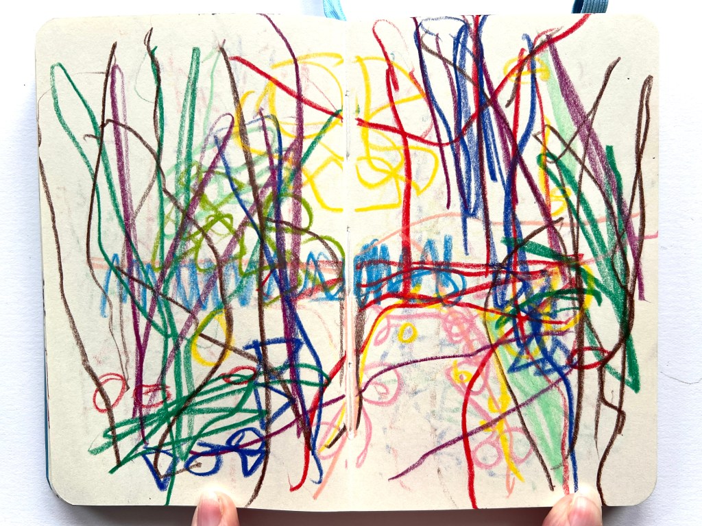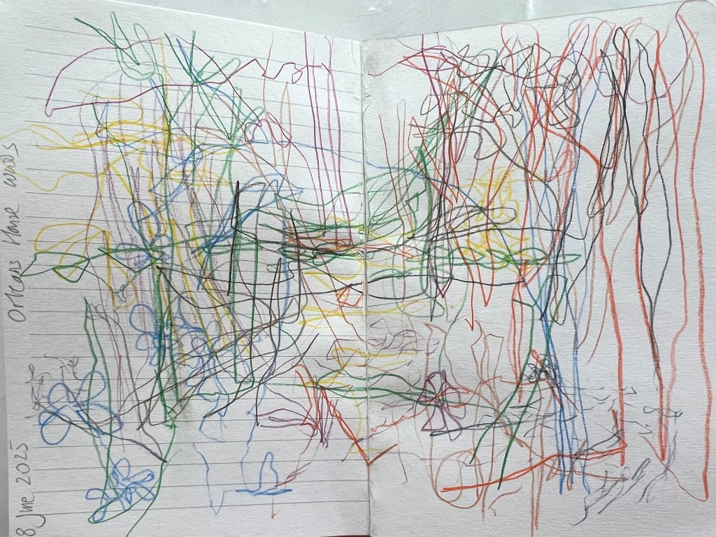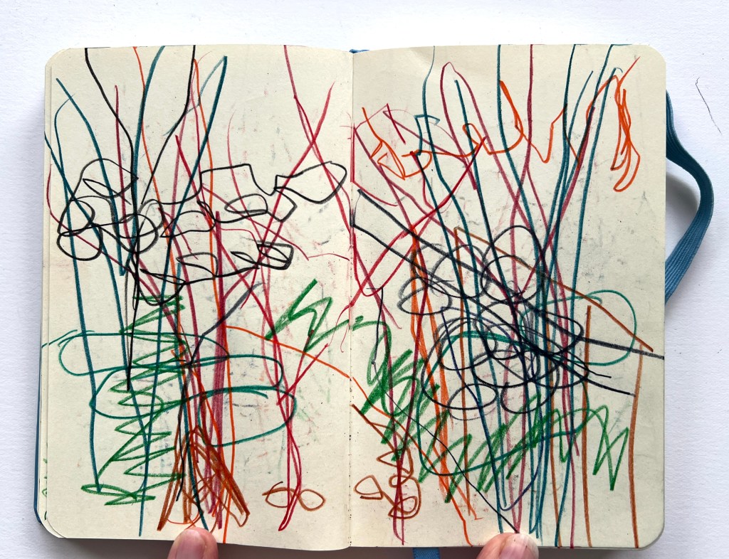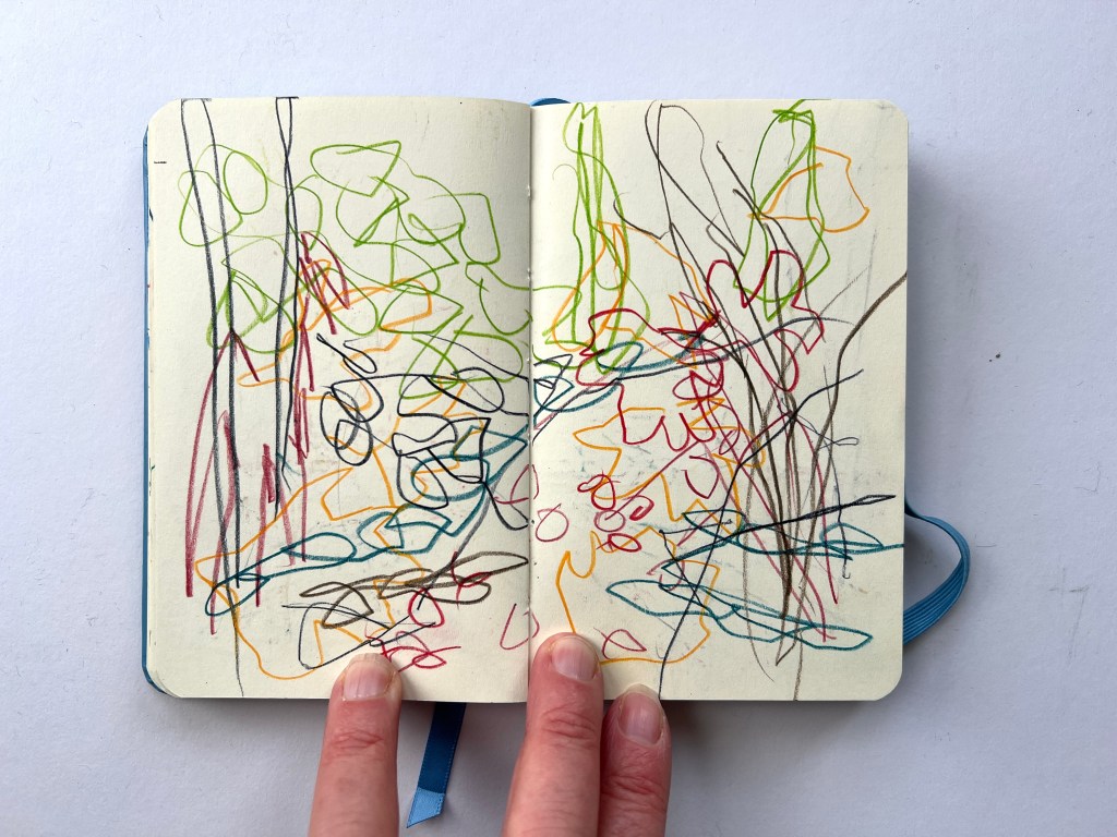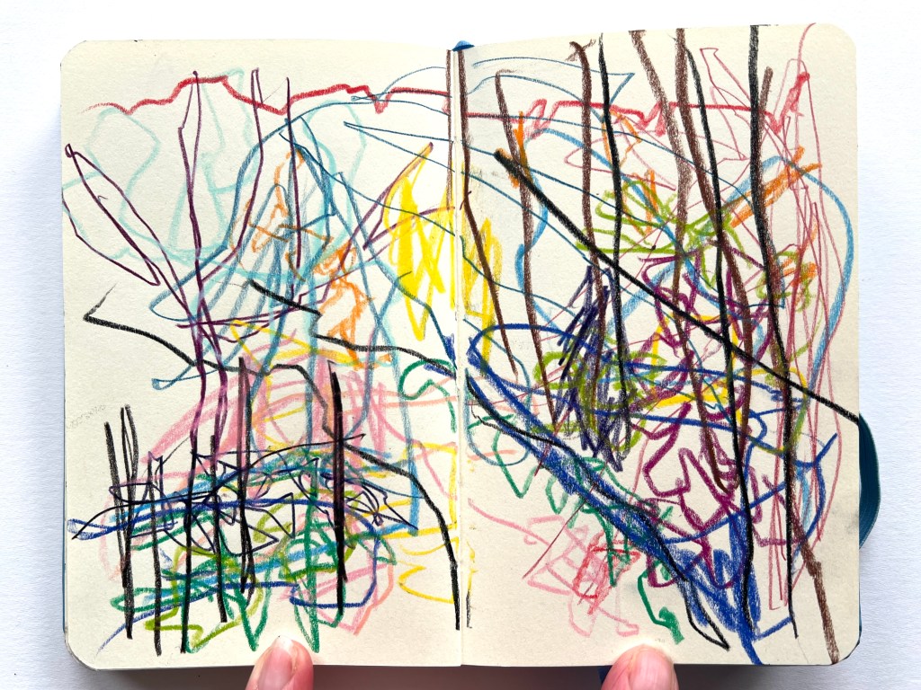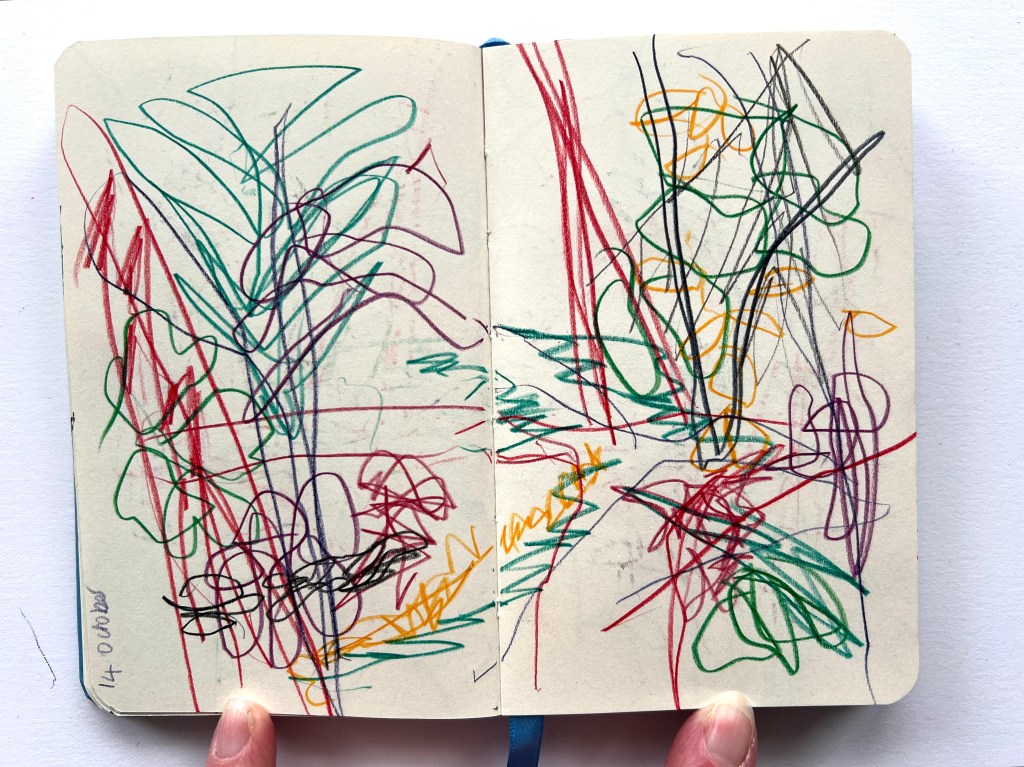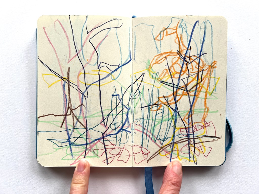 When I wasn’t successful, I decided to carry out one part of it anyway, walking and drawing in the woods by the gallery, to see what happened. I use a small book that I can hold open in one hand and each time I go I aim to fill only 3 pages, to make it quick and easy with no pressure.