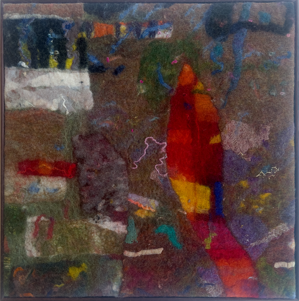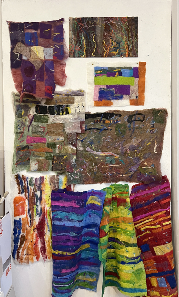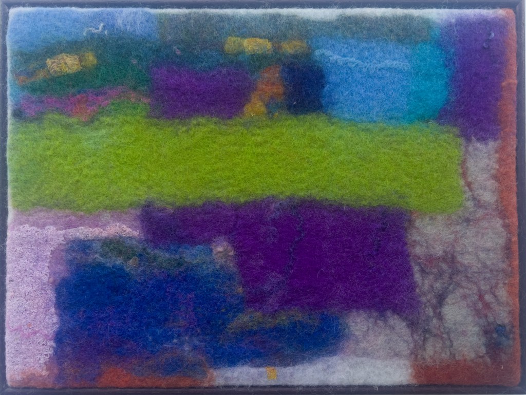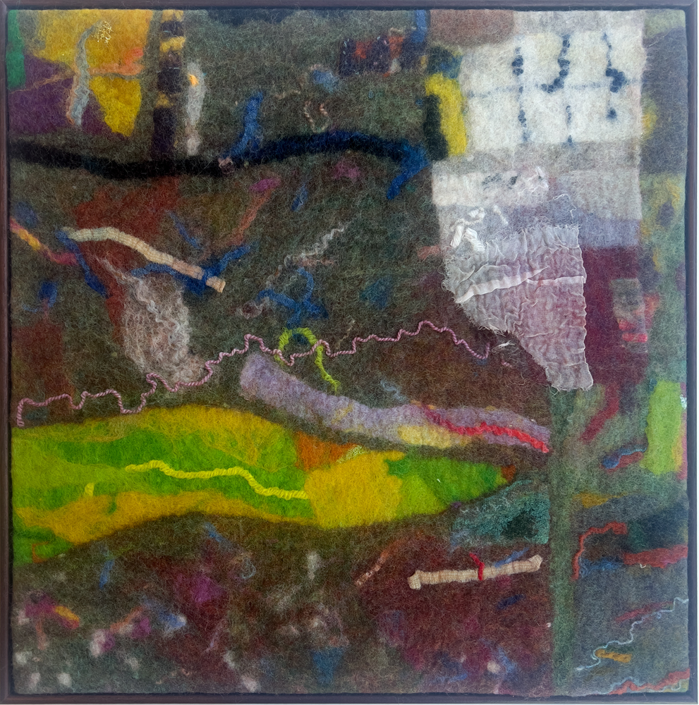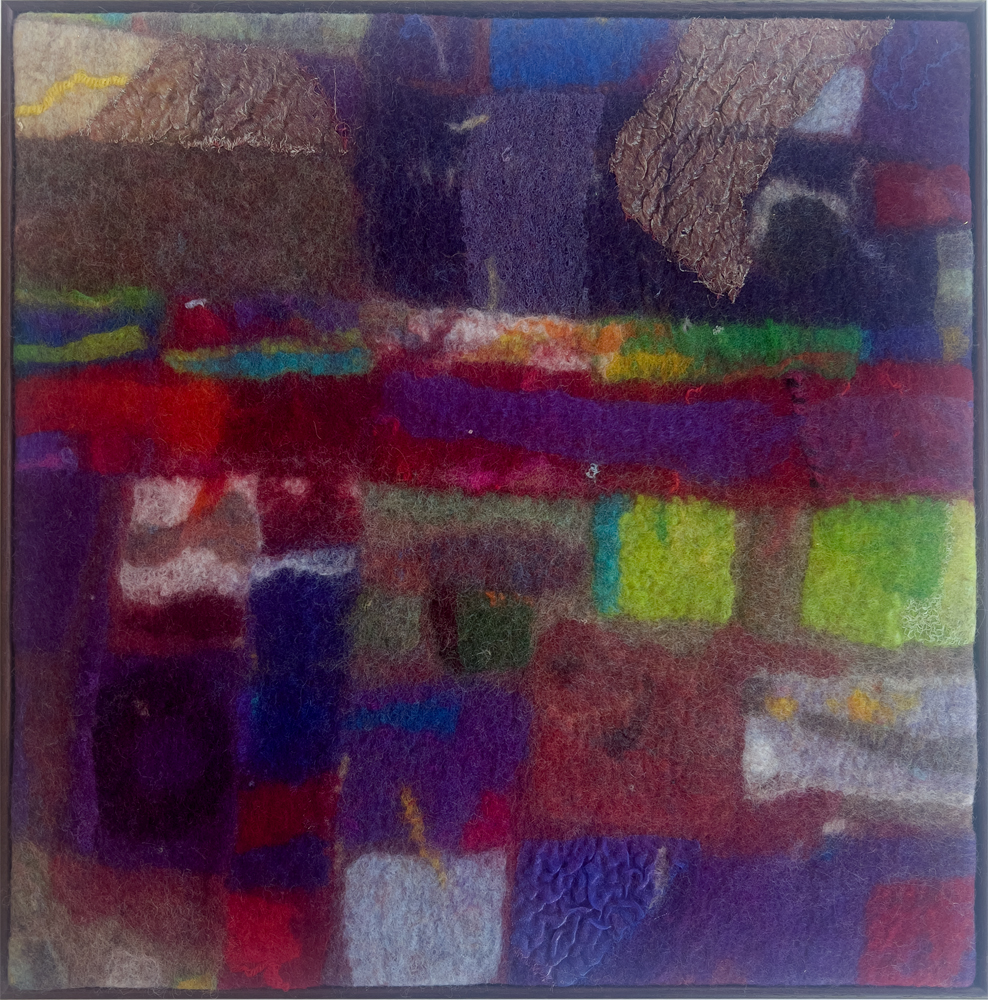Besides adding other materials, mostly threads and fabrics, I almost always make work from pre-felts, often starting with bits and pieces left over from other projects or from playing with new fibre or a new idea. So there is a history of my thinking tangled up in them.