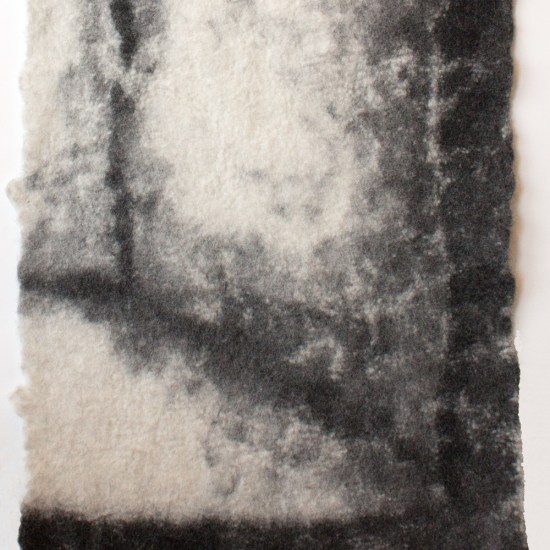 This first felt piece looks at using a ‘soft pixelation’ technique, derived from my lasting interest in pixelation generally, and the way pixelation breaks down an image, removing information and re-presenting it in small units. An aquatint and etching by Chuck Close, Phil Spitbite, 1995, a portrait of his friend, the composer Philip Glass, held by the British Museum suggested moving away from square units; and an experiment with a technique for manipulating wool fibre showed that it could be a way of creating a range of tones, using fibre like graphite powder.