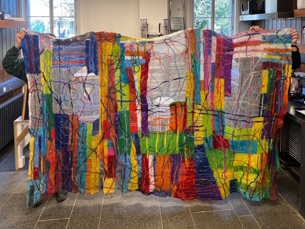 I wrote on another page about my experience on a residency which transformed the relationship between my drawing practice and my textile practice. The piece in this photograph is the first large scale outcome: In Arthog Bog, 2026: wool fibre, fabric, thread; wetfelting; 220cm x 165cm.