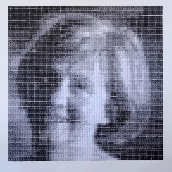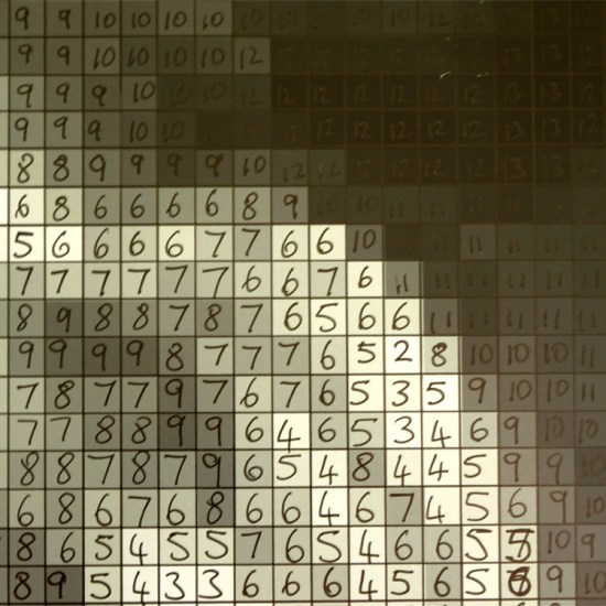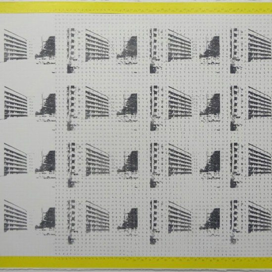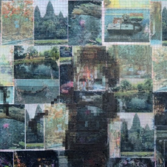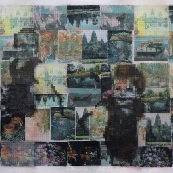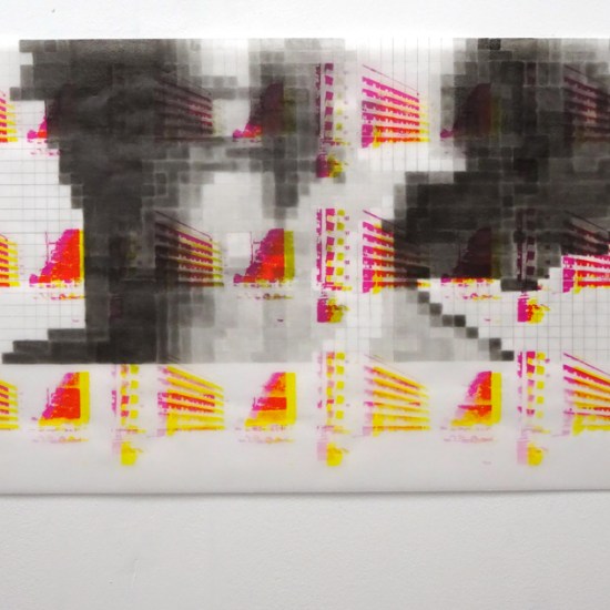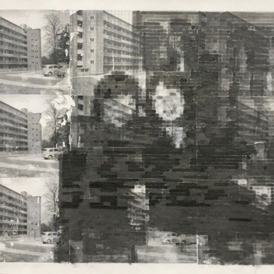 Piecework, 2017: composite drawing; graphite; pinhole camera image printed on film, acrylic photo transfer, screen print on tracing paper; outer dimensions 120cm x 120cm